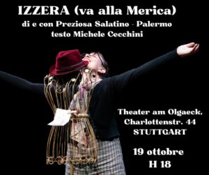 Izzera è un monologo teatrale che ha per protagonista una ragazza che, alla fine degli anni 20 dello scorso secolo, parte da un paesino delle zone montuose della Lucchesia per raggiungere il fidanzato emigrato a San Francisco. Ne emerge un disorientamento anche linguistico: come tutti gli altri, Izzera infatti a poco a poco parlerà l’italiese, quello strampalato miscuglio di italiano e inglese tipico degli emigrati di prima generazione: una commistione goffa eppure estremamente poetica, che racconta il disperato tentativo di integrarsi in una realtà tanto diversa da quella di origine da parte di chi è destinato ad abitare una “terra di mezzo”, quella di chi non è ancora e allo stesso tempo non è più.